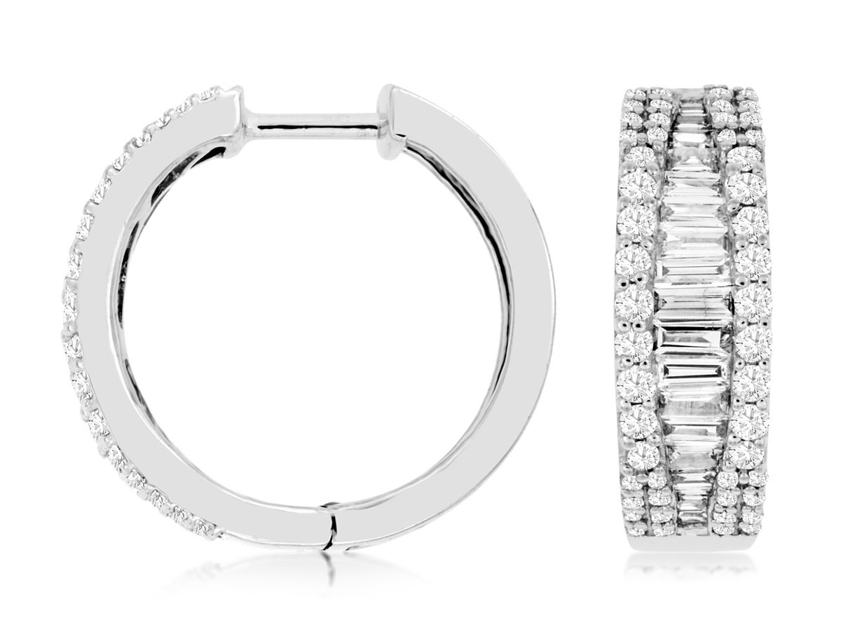 Elevate your look with a symphony of sparkle. Featuring a captivating blend of baguette and round brilliant diamonds arranged in a multi-row channel, these hoops exude modern elegance. Experience the luxury and confidence that only truly remarkable diamond earrings can provide.