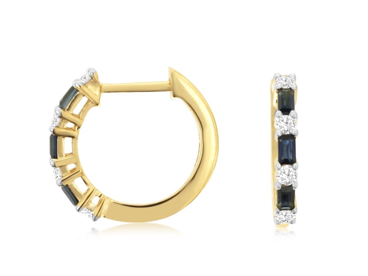Unleash vibrant elegance with our exquisite 14K yellow gold hoop earrings. These captivating sapphire statement pieces feature a brilliant array of alternating deep blue baguette sapphires and sparkling round diamonds, meticulously set to catch every ray of light.