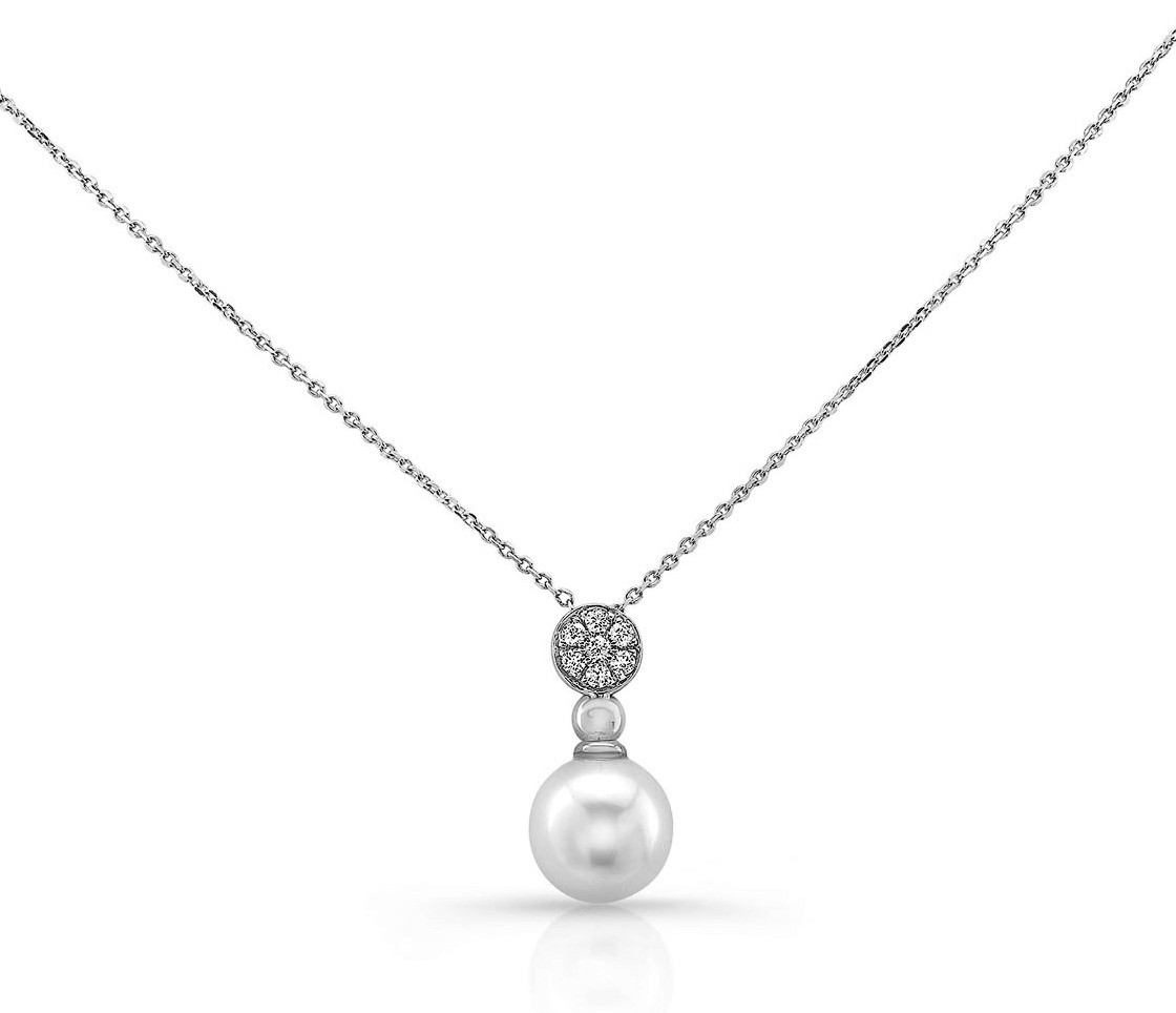 Experience unparalleled elegance with our stunning 14K white gold necklace. A magnificent, luminous pearl dangles exquisitely, suspended beneath a dazzling cluster of brilliant diamonds, creating a captivating lariat-style drop.