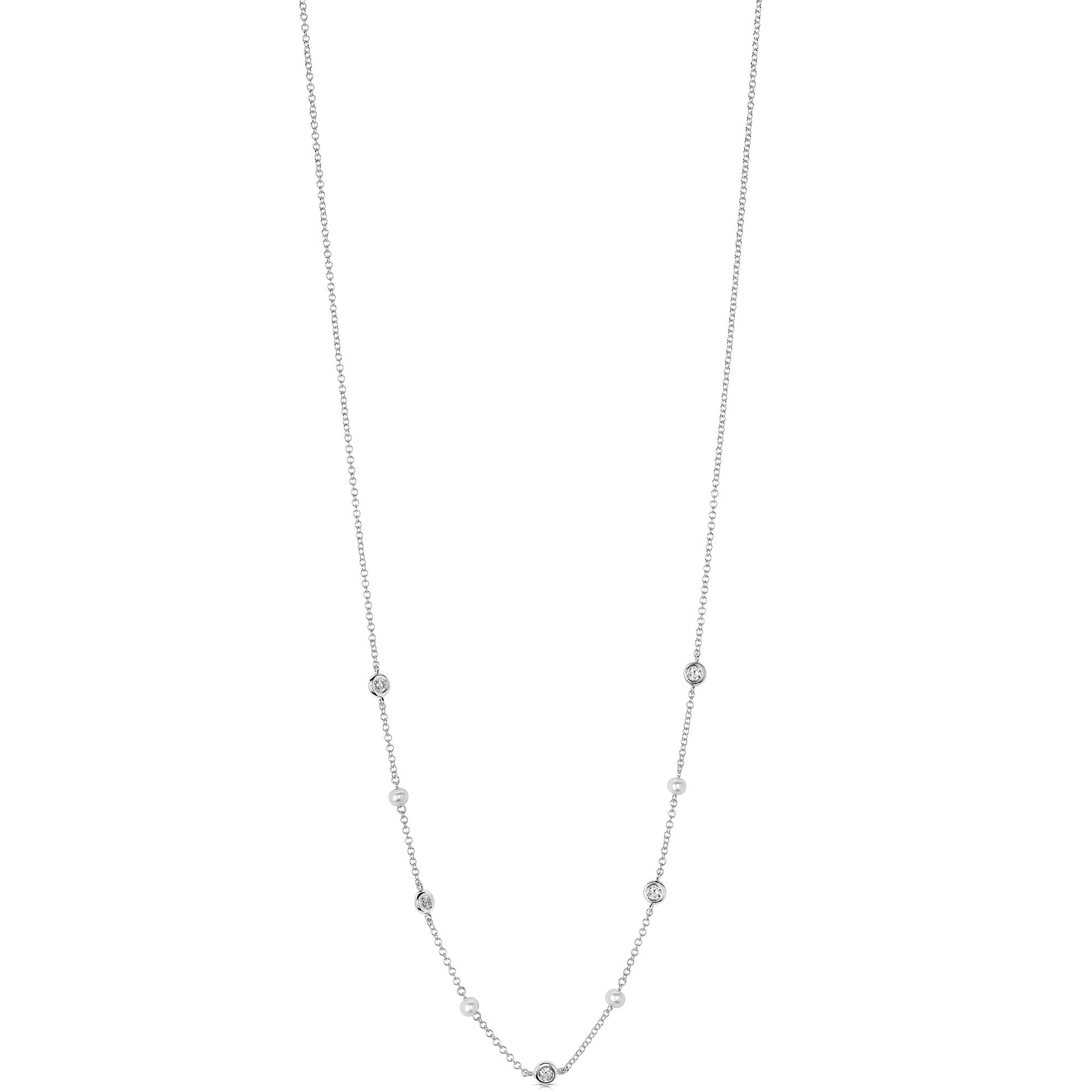 Discover breathtaking elegance with our 14K White Gold Pearl and Diamond Necklace. This exquisite piece intricately weaves the classic luminosity of pearls with the dazzling sparkle of .20CTW diamonds, each bezel-set to catch every light.