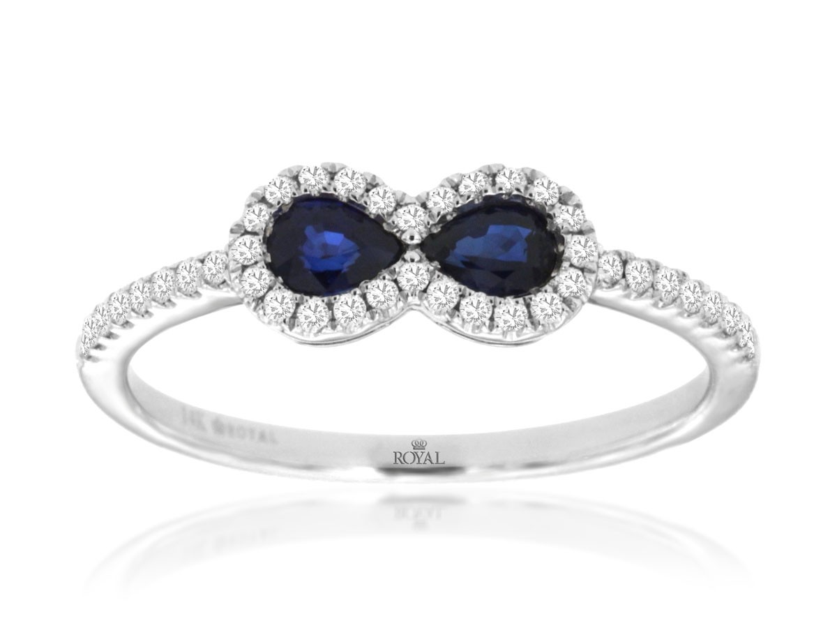 Celebrate endless love with our captivating 14K White Gold Infinity Ring. Two mesmerizing .44 carat pear-shaped sapphires, vibrant and deep, are cradled in brilliant diamond halos, forming a breathtaking figure-eight design. The sparkling .17 carat diamond-encrusted band adds exquisite radiance to this unique sapphire ring.