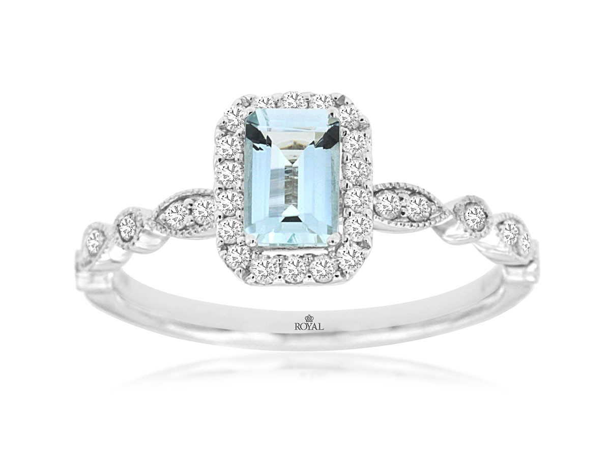 Prepare to be captivated by this stunning 14K white gold color ring! A brilliant 0.45ct emerald-cut aquamarine, radiant like tranquil ocean depths, commands attention, encircled by a dazzling halo of sparkling diamonds that amplify its luminous charm.