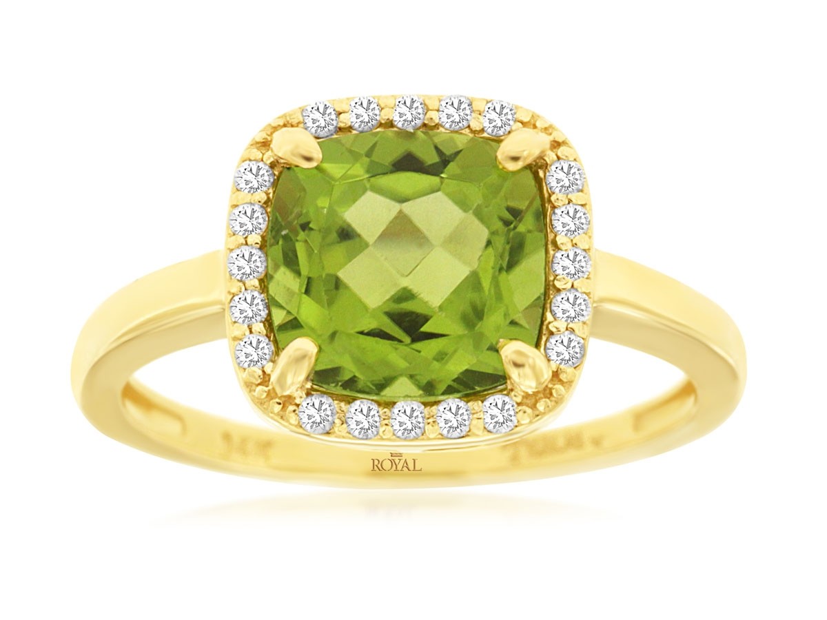 Cradled in lustrous 14K yellow gold, a dazzling halo of .13 total carat weight diamonds encircles the peridot, amplifying its radiant glow. This exquisite piece is a stunning celebration of color and light, destined to become a cherished favorite.