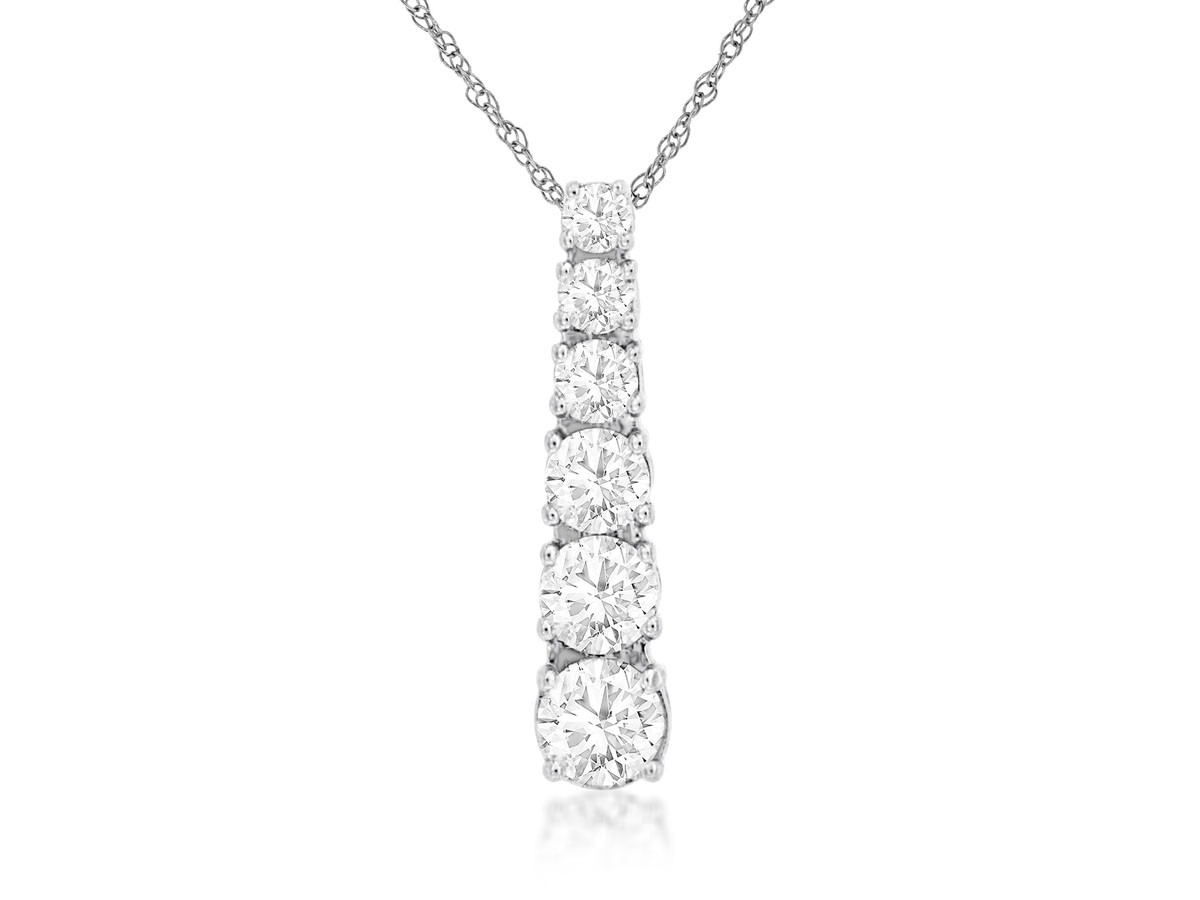 Prepare to be mesmerized by this breathtaking 14K white gold diamond pendant! Six brilliant-cut diamonds gracefully descend, each stone larger than the last, creating a cascade of unparalleled sparkle. With a dazzling .60 CTW, this graduating pendant captures and reflects light, ensuring all eyes are on you.