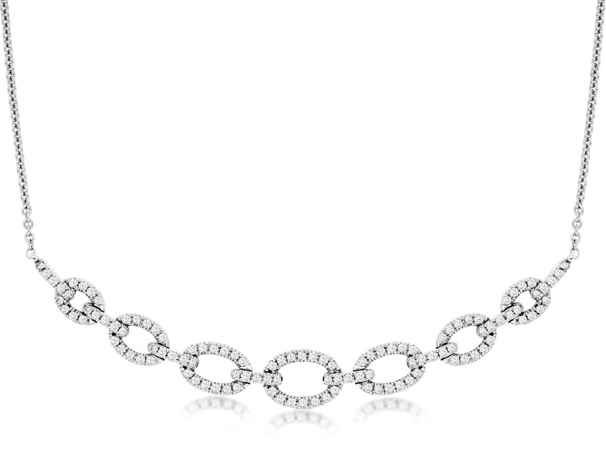 Adorn your décolletage with this breathtaking 14K white gold diamond necklace. Seven exquisite oval links, each meticulously paved with dazzling diamonds, create a radiant focal point that shimmers with every movement. A quarter carat of brilliant diamonds ensures an undeniable sparkle.