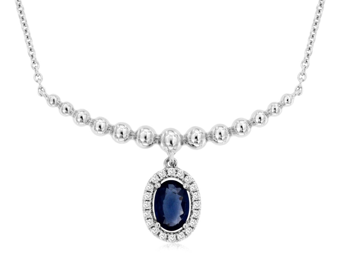 Discover timeless elegance with this captivating 14K white gold necklace. A vibrant 0.65 CTW oval sapphire commands attention, its mesmerizing deep blue encircled by a dazzling halo of 0.08 CTW brilliant diamonds, amplifying its radiant sparkle.
