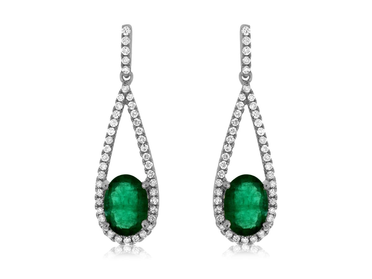 Discover unparalleled elegance with these 14K white gold dangle earrings. Featuring mesmerizing 1.40-carat oval emeralds, each surrounded by a dazzling halo of brilliant round diamonds. The graceful teardrop design, studded with 82 radiant diamonds totaling 0.35 carats, ensures every movement sparkles with captivating allure.