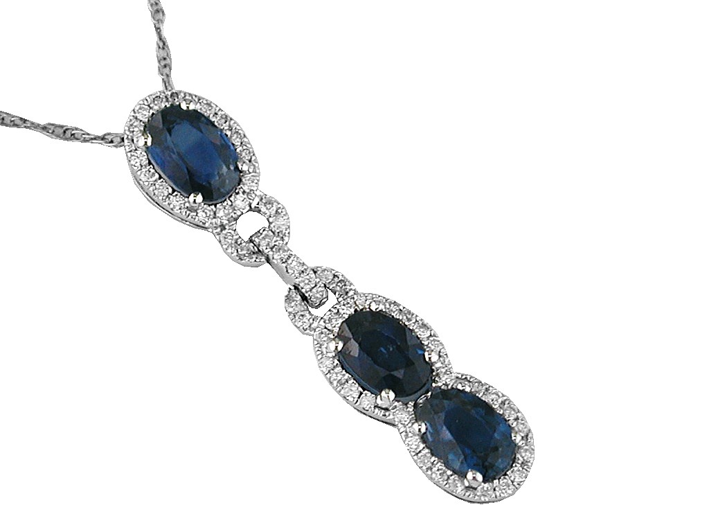Command attention with this captivating 14K white gold pendant, a cascade of vibrant blue. Three exquisite oval sapphires, totaling 1.80 carats, radiate a mesmerizing deep ocean hue, each a focal point of dramatic elegance. Their intense color truly makes a statement.
