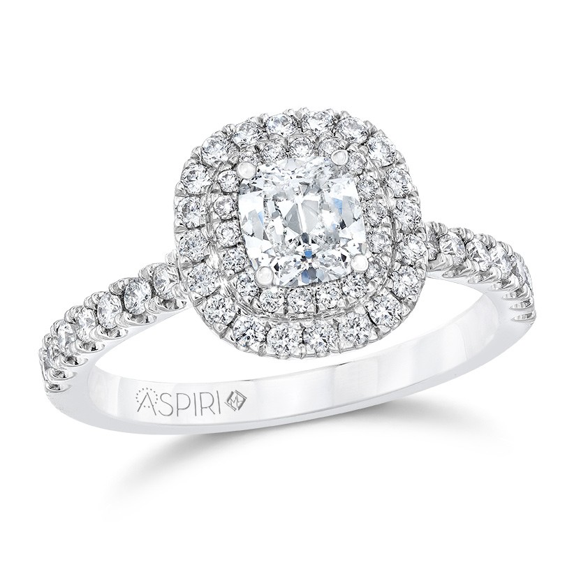 The elegant sophistication of this elongated 0.31 carat Cushion cut diamond is enhanced by 56 round diamonds set into the single row halo rolling around the finger. Total diamond weight is 0.87 carats, G color VS1 clarity.