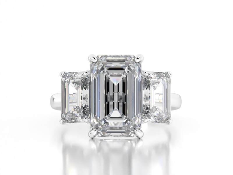 Experience breathtaking brilliance with our magnificent three-stone emerald cut ring. A commanding 4.76 carat lab grown center diamond, flanked by two perfectly matched emerald cuts weighing 3.25 carat, creates an unparalleled display of sophisticated sparkle. Each precise facet captures and reflects light with mesmerizing elegance, promising an unforgettable impression.