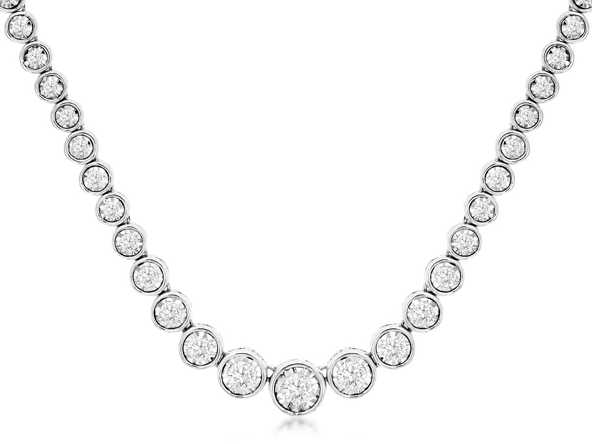 Unleash breathtaking brilliance with our stunning 1.50CT Bezel Tennis Necklace. Each exquisite diamond, securely encased in sleek 14K white gold bezels, creates a continuous line of captivating sparkle that gracefully adorns your neckline. This modern twist on a classic design radiates unparalleled sophistication.