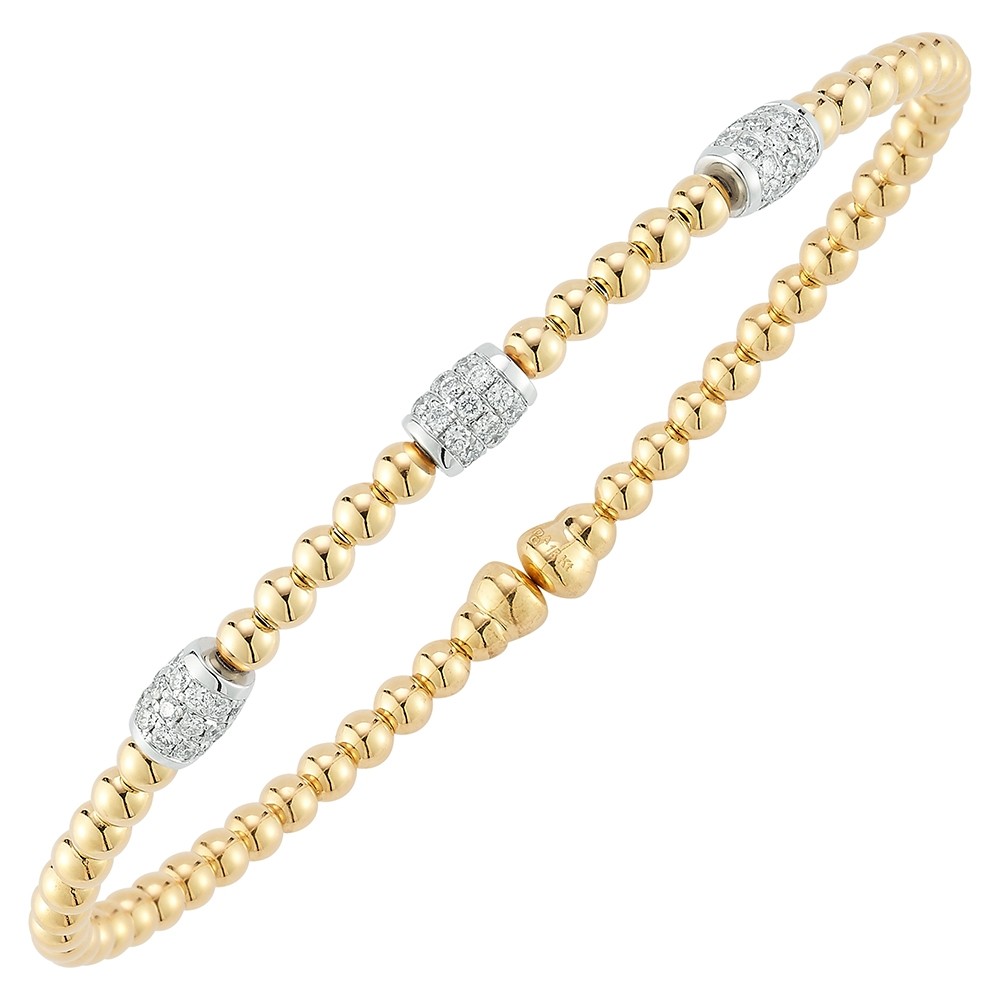 Discover a captivating 18K yellow gold bangle bracelet that gleams with sophistication. Its radiant beaded design is punctuated by three dazzling stations, each meticulously pavé-set with a total of .40 carats of brilliant diamonds, creating an irresistible play of light.
