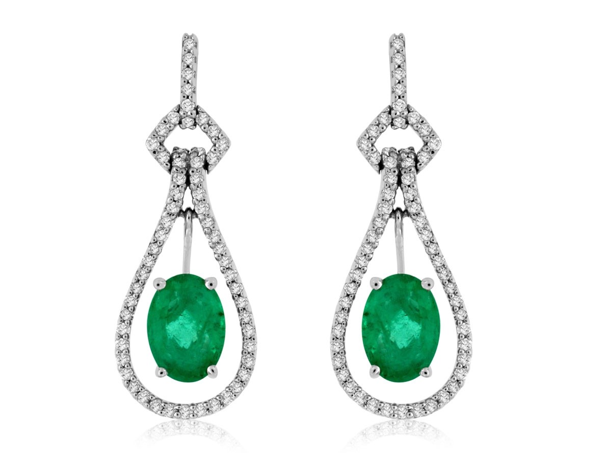 Dazzle with these breathtaking 14K white gold drop earrings, featuring vibrant emeralds totaling 1.40 CTW. Each exquisite oval emerald, cradled within a sparkling diamond embrace, creates a captivating splash of color that promises to turn heads with every graceful movement.
