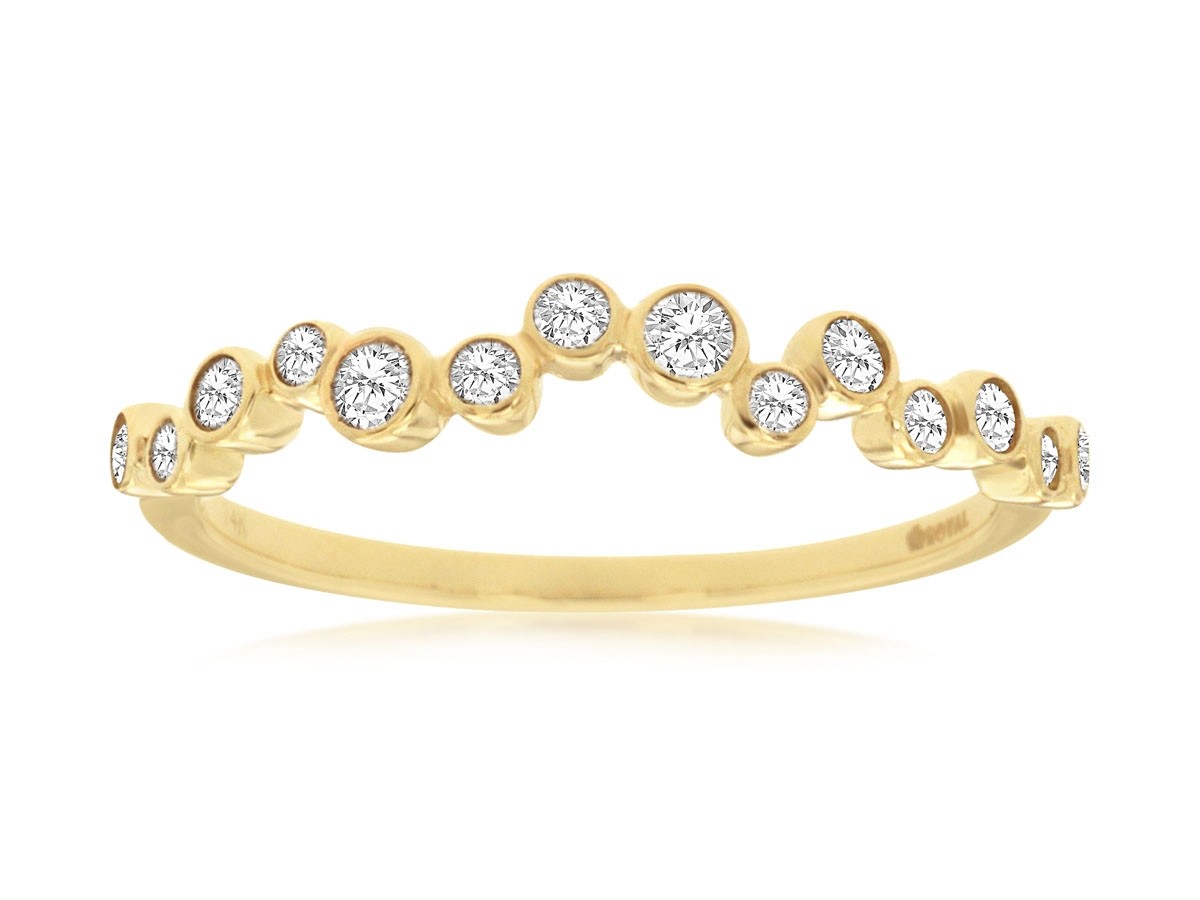 Dive into effervescent elegance with the Royal Jewelry Diamond Bubble Ring! Crafted from lustrous 14K yellow gold, this captivating band showcases a playful dance of round diamonds. Each brilliant 0.26 CT TW diamond is nestled in bright, polished bezel settings, creating a unique, undulating sparkle.