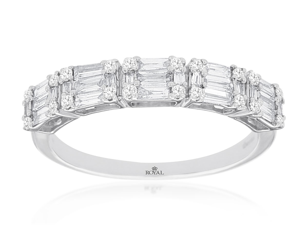 Experience unparalleled brilliance with this Royal Jewelry diamond wedding band. A mesmerizing symphony of 20 dazzling round diamonds and 25 sleek straight-cut baguettes creates a captivating sparkle that commands attention, all set in lustrous 14K white gold.