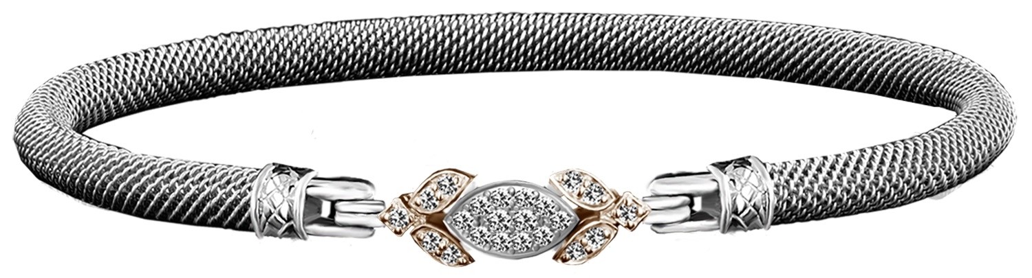 Sterling silver mesh bracelet with yellow gold details and lab grown diamonds. The total carat weight of the lab grown diamonds is .40. The yellow gold details are in petal-like shapes, and have lab grown diamonds inside. By Goldman-Kolber.