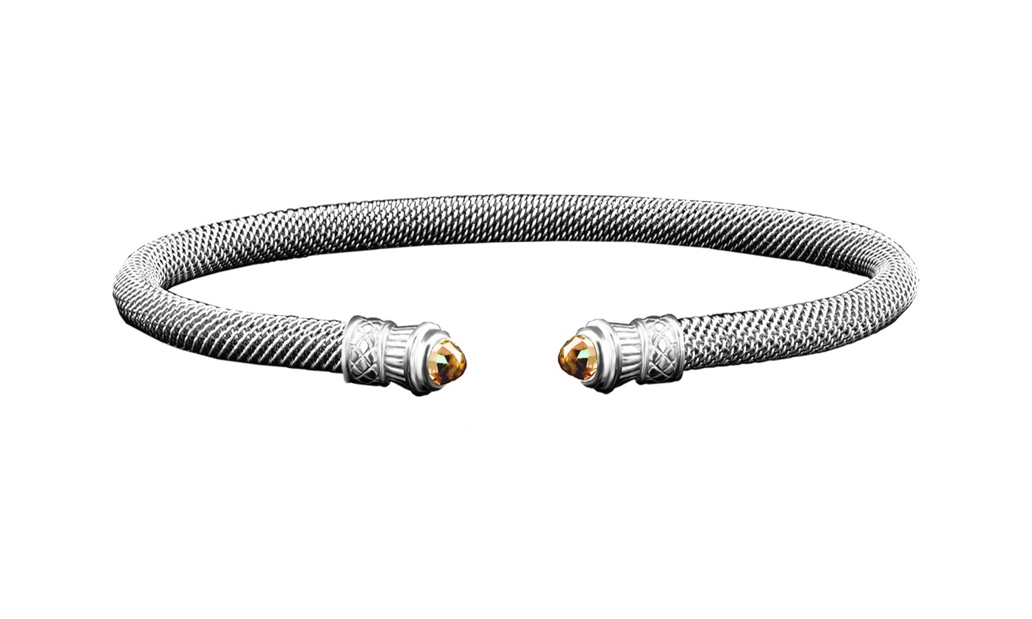 Sterling silver mesh cuff bracelet with two Citrine gemstones at each raised end. Perfect for a birthday, anniversary, or holiday gift! By Goldman-Kolber.