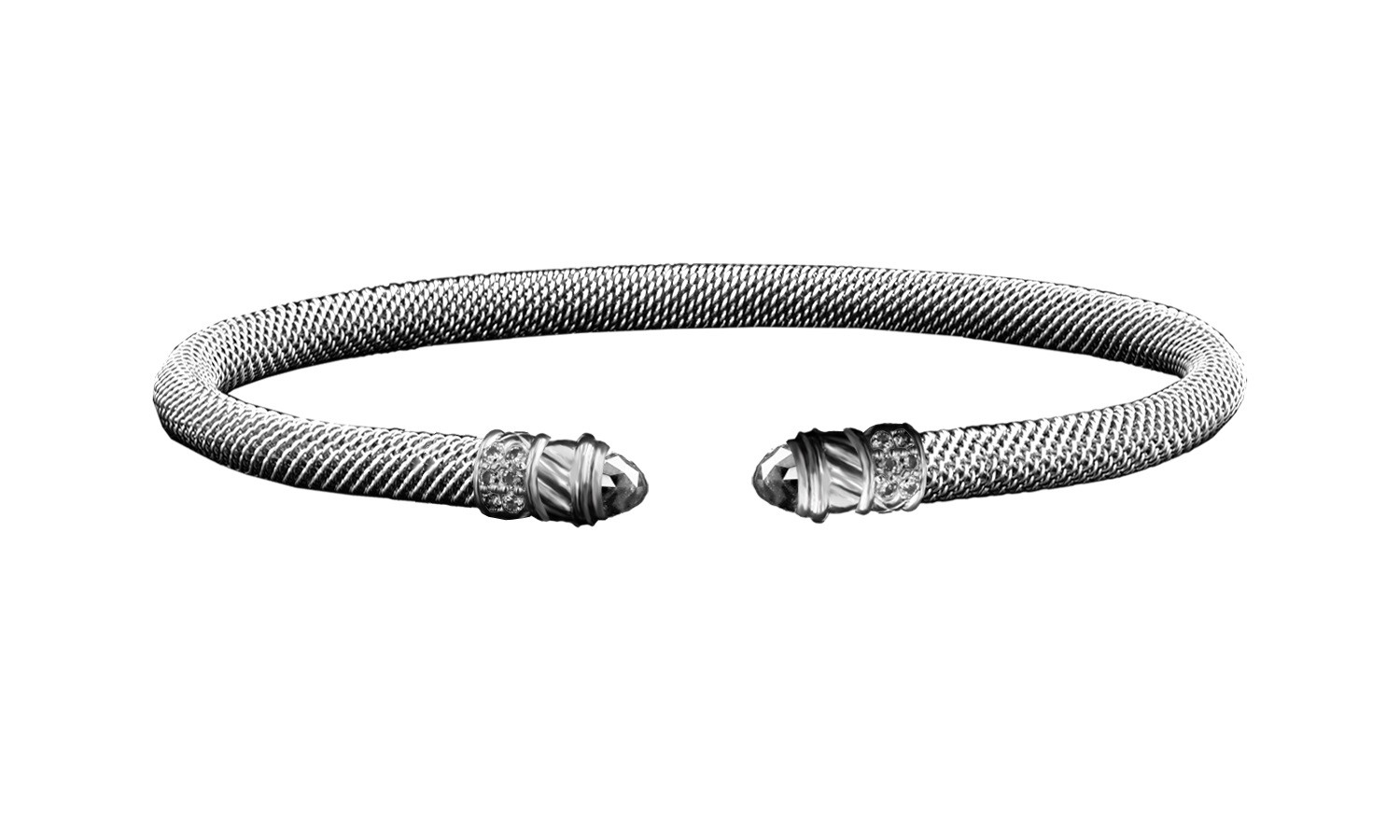 Sterling silver mesh cuff bracelet with two white topaz gemstones at each end. By Goldman-Kolber.
